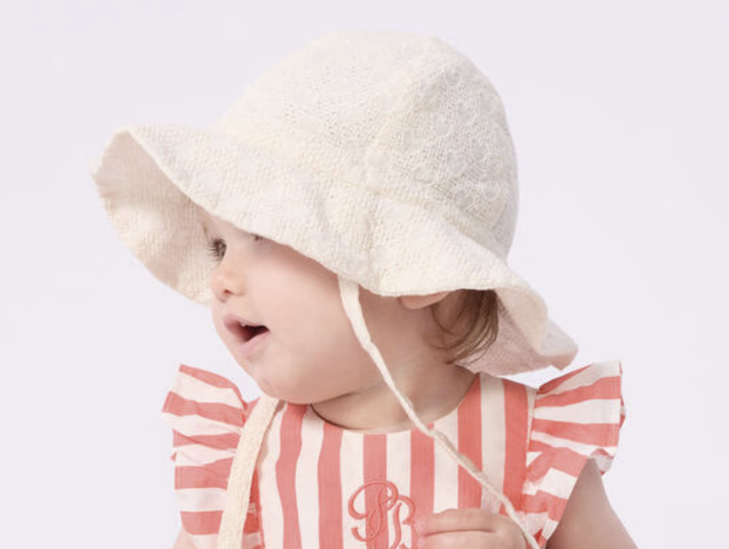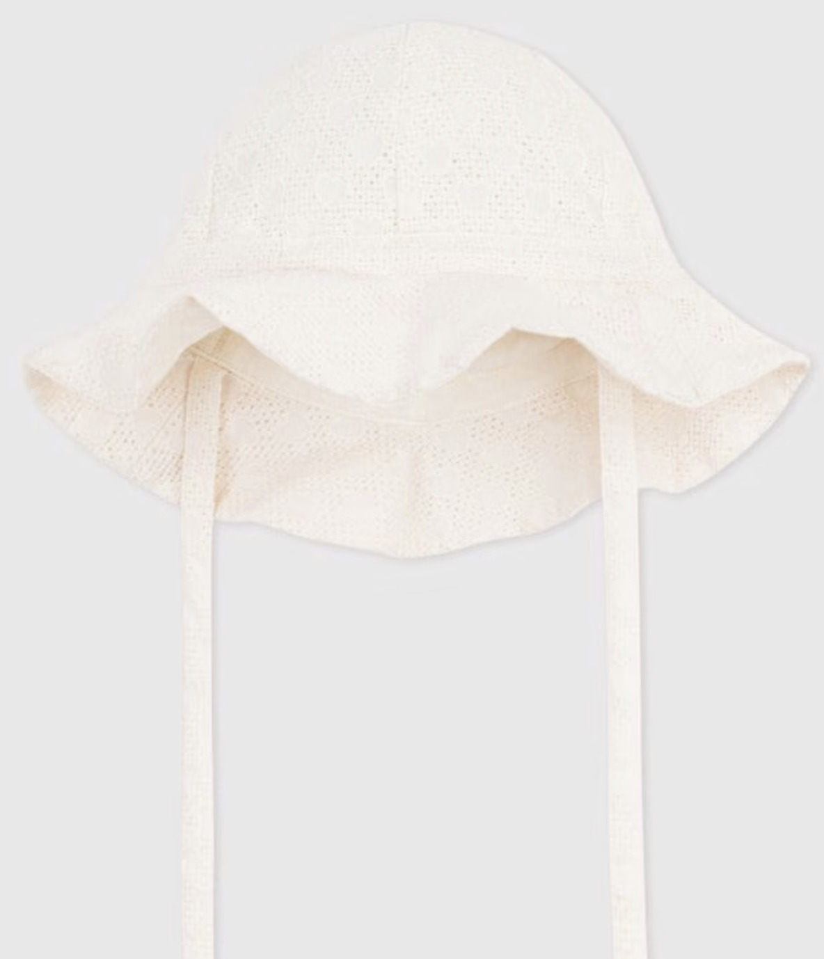 Cappellino in popeline e sangallo, con lacci da annodare