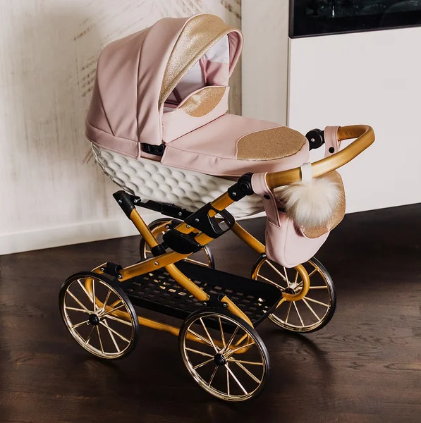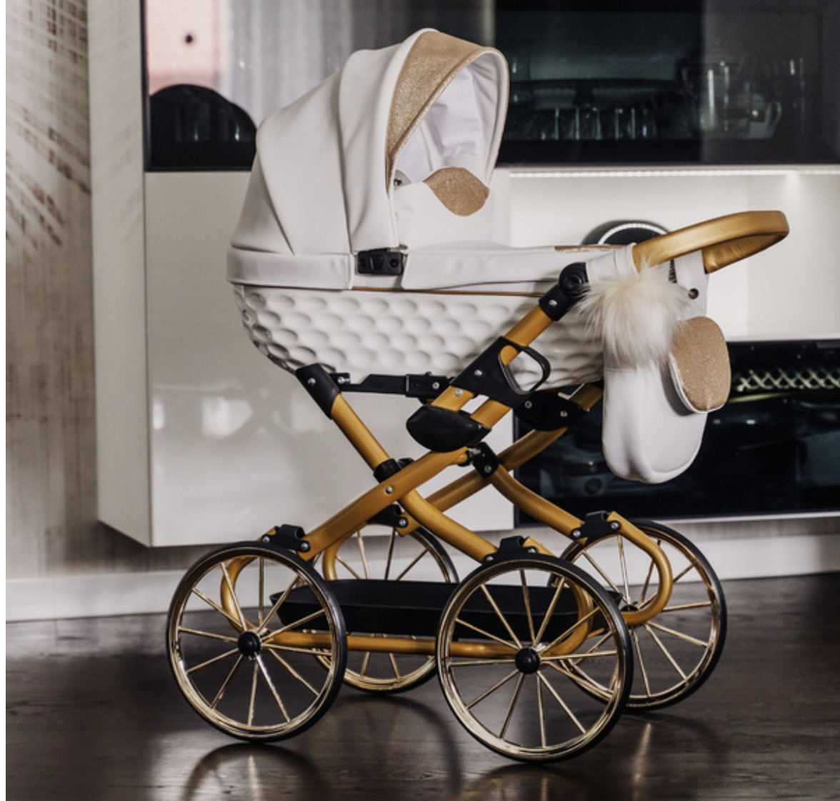 Telaio classico pieghevole , maniglione regolabile Maniglia di spinta rivestita in ECOPELLE ORO , Borsa Decorazione a pompon ,Peso: 6,2 kgDimensioni: Altezza da terra al bordo della navicella: 60 cm ,Altezza del maniglione: max. 76 cm / min. 45 cm, Larghezza: 42 cm