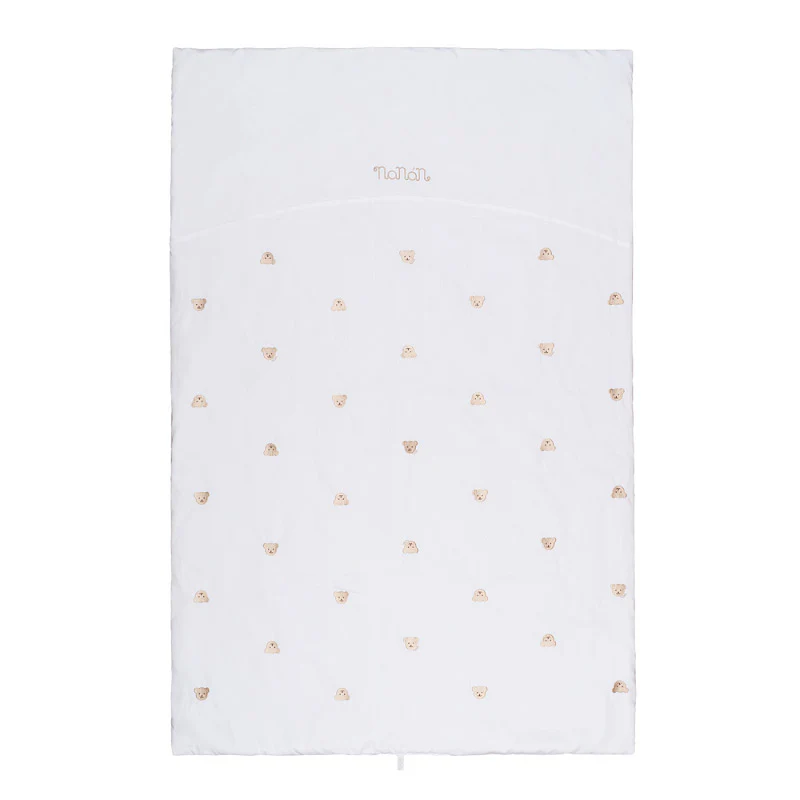 La copertina Nanàn della collezione Tato Orsetto è ideale per i mesi più freddi per tenere al caldo il bebè nel suo lettino. Composta da morbidisimo jersey di cotone di colore bianco è facile al lavaggio e alla pulizia, impreziosita da cuori ricamati su tutta la copertina e dell’applicazione del dolce orsetto Tato.
