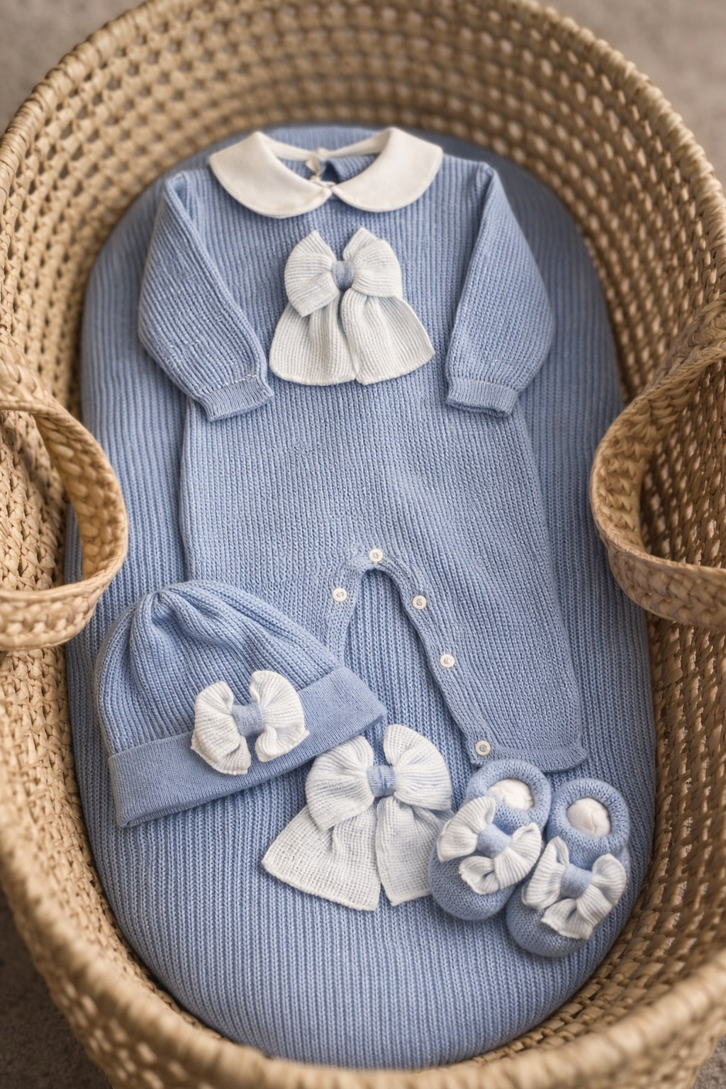 tutina in filo, con scarpina e cappello.